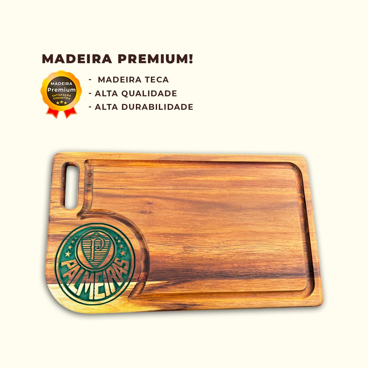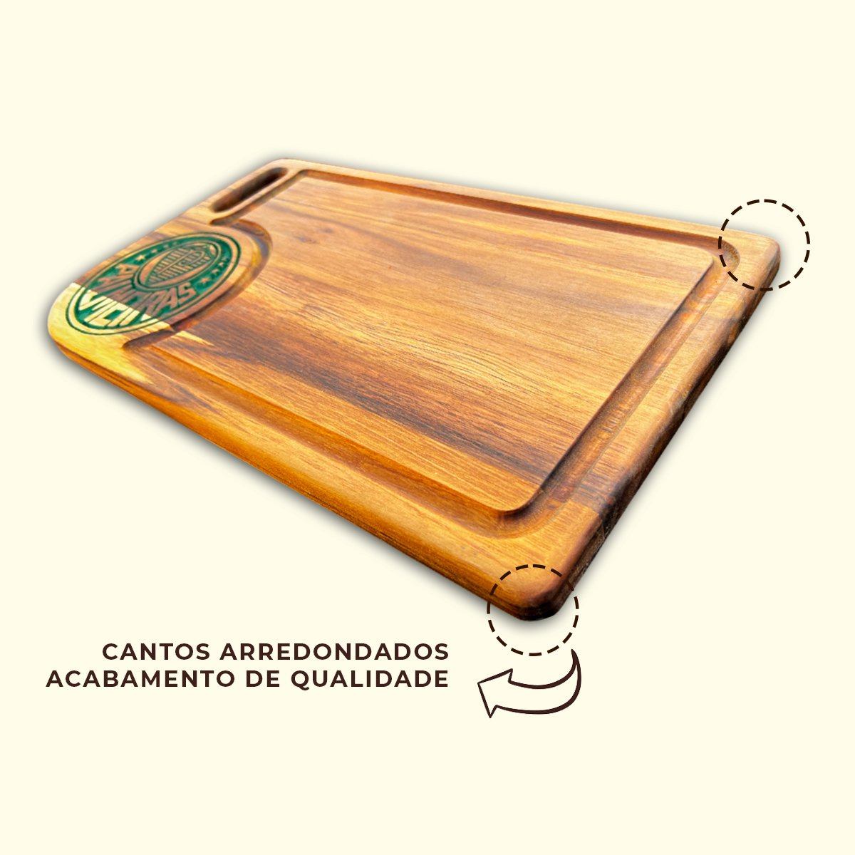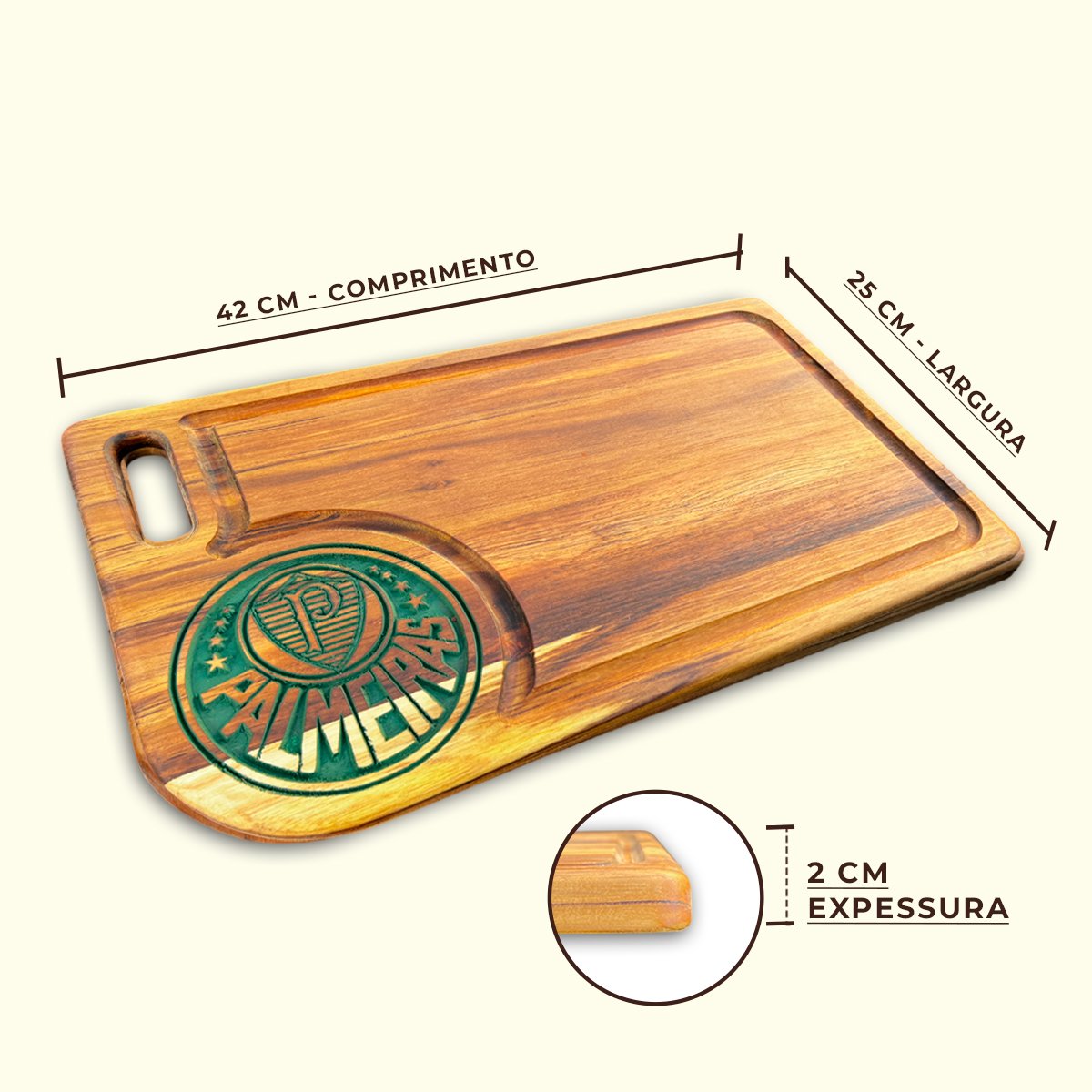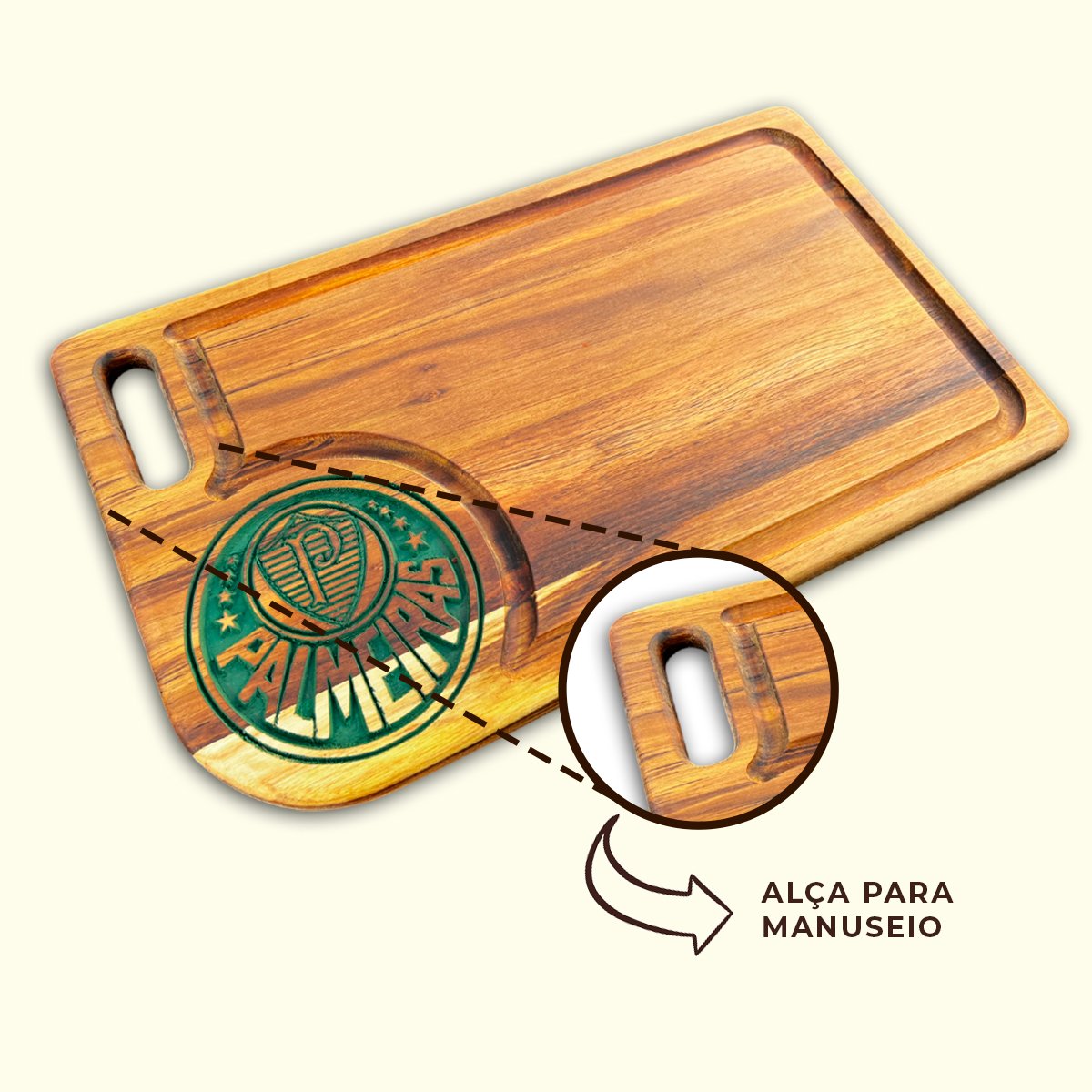 Leve a paixão pelo Palmeiras para o seu churrasco! Apresentamos nossa tábua de carne em madeira premium, com o brasão do Palmeiras gravado com precisão e um acabamento de tirar o fôlego. Esta peça não é apenas funcional, mas também uma forma única de expressar seu amor pelo Clube em qualquer ocasião.